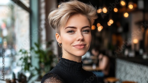 Young Woman with Short Hair Smiling in a Stylish Café Interior