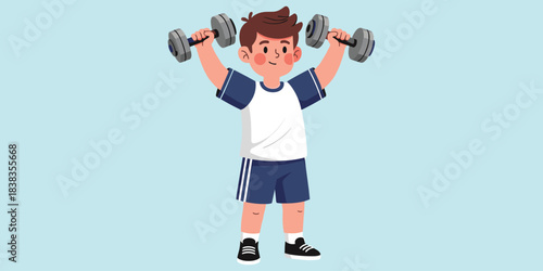 Youth fitness illustration, cartoon person lifting dumbbells, strength training icon, healthy lifestyle vector, exercise concept artwork