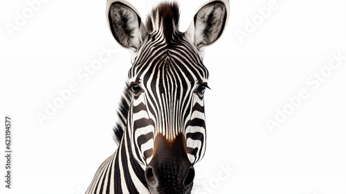 Zebra portrait isolated on white background with clipping path. Close-up.
