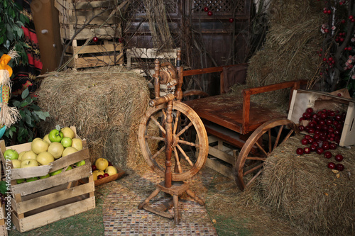 vintage, old, spinning wheel, spindle, wooden, device, for, manual, spinning, threaded, ancient, mean, production, peasant, russian, oriental, workshop, background, historical, tree, hay, hayloft, inside, cartSHARE