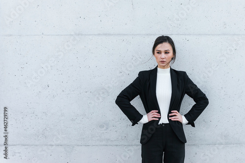 young, woman, wearing, black, suit, standing, concrete, wall, individuality, copy space, 1, people, adult, business, female, outdoors, day, spain, white, hair, blazer, businesswoman, lifestyle, confidence, hand, hip, self-confidence, caucasian, dark hair, jacket, fashion, lookingSHARE