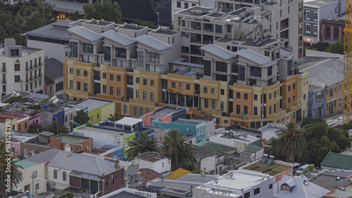 Duvet Covers: View of vibrant hues dance across the facades of tightly packed buildings, a tapestry of urban life under a soft sky, Cape Town, Western Cape, South Africa.