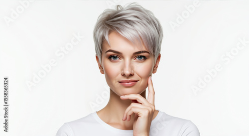 Duvet Covers: Woman with platinum silver pixie cut touching chin with finger on white background. Short ash blonde hairstyle with side swept styling for modern salon services