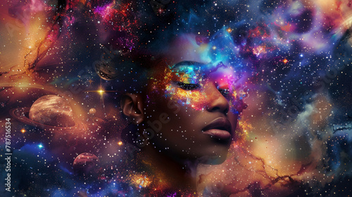 stunning, black, woman, surrounded, rainbow, colours, evocative, galaxy, bursting, vibrant, star, planet, embodiment, celestial, beauty, feature, clothing, adorned, shimmering, design, african, fashionSHARE