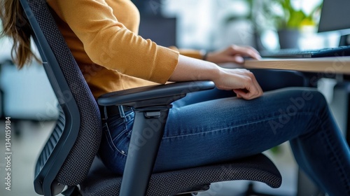 chair, office, desk, woman, working, sitting, arm, jean, yellow, shirt, computer, keyboard, hand, body, posture, back, support, seat, ergonomic, workplace, clothing, casual attire, inside, modern, lifestyle, indoor, relaxation, comfort, employee, typing, professional, labor, person, furniture, detail, side, view, frame, structure, fabric, texture, armrest, wooden, plant, daylightSHARE