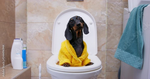 dog, sit, seat, bathrobe, privies, gas production, sniff, yellow, puppy, smell, towel, bathroom, baby, children, behaviour, childhood, home, hygiene, little, pot, training, sanitary, bathe, fun, naughty, playful, pretty, troublemaker, washroom, happy, urine, excrement, humor, smart, mischievousness, wc, domestic, pet, animal, dachshund, sausage, family, obedience, adorable, cute, surpriseSHARE