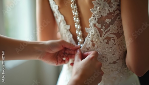 bride, wedding, dress, lace, elegant, bridal, preparation, delicate, back, gown, hand, buttons, romantic, wedding day, fashion, intimate, closeup, detail, pattern, ceremony, celebration, special occasion, femininity, love, marriage, intricate, stylish, tradition, sewing, custom, design, timeless, glamour, beauty, ornament, luxurious, fabric, chic, craftsmanship, hand-made, decor, pearl, fastener, attire, clothing, garment, apparel, bridal gownSHARE