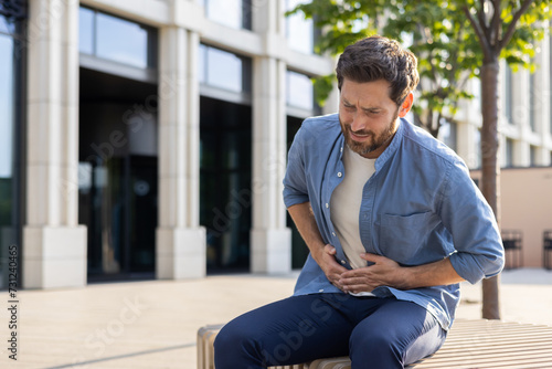 businessman, abdominal pain, unwell, beard, mature, casual attire, discomfort, outdoors, business building, pain, health, male, distressed, sick, adult, emergency, city life, men at work, corporate, disease, painful, health care, problem, stress, reaction, suffering, medicals, expression, trouble, concern, cramp, ill, upset, professional, fatigue, street, employee, urban, help, man, lifestyle, urban scene, sitting, bench, difficulty, uncomfortable, affectSHARE