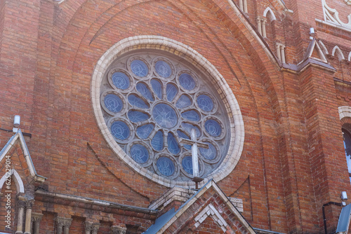 church, stained-glass, window, catholic church, catholic, stained, glasses, wall, brick, red, building, historical, architecture, holy, cross, religion, outdoors, exterior, old, russia, nobody, closeup, ornament, pattern, gothic style, redbrick, decoration, neogothic, round, circle, stone, detail, cathedralSHARE