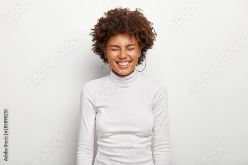iPhone Cases: Horizontal portrait of joyous Afro female laughs loudly, keeps eyes closed, being in good mood, wears turtleneck, isolated on white background. People, satisfaction, pleasure, ethnicity, emotions