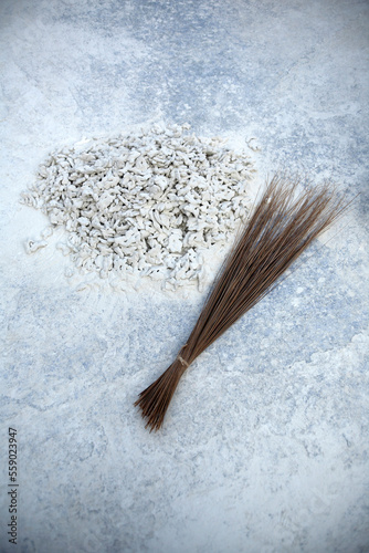 asia, brush, bundle, coated, cochin, color image, daytime, ginger, india, industry, mineral, outside, powder, spice, still life, tool, travel, twig, vertical