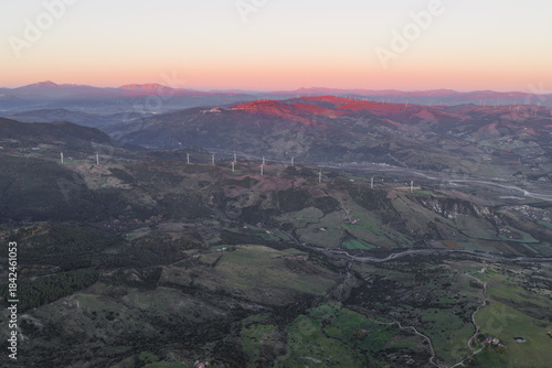 Pillows: Aerial view of the sun kissing the wind turbines atop rolling green hills, a symphony of nature and technology harmonizing under a pastel sky, Rotondella, Basilicata, Italy.