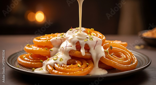 Pillows: Indulge in the sweet, sticky delight of golden jalebi drizzled generously with creamy white rabri and sprinkled with vibrant pistachios and saffron threads, a truly irresistible dessert experience.