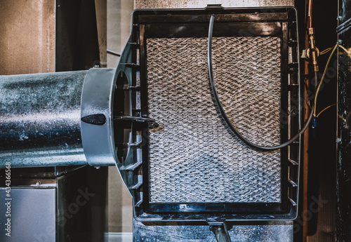 Pillows: Open whole house humidifier with trickling filter pad and damper exposed