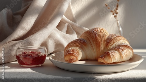 croissant, pastry, breakfast, brunch, bakery, baked goods, flaky, gold, fresh, homemade, dessert, snack, sweet, jam, glass bowl, plate, table, still life, food photography, closeup, morning, cosy, natural light, sunlight, minimal, minimalism, rustic, linen, fabric, home, kitchen, cafes, copy space, comfort food, indulgence, epicure, traditional, european, meal, appetence, simple, delicious, croissantSHARE