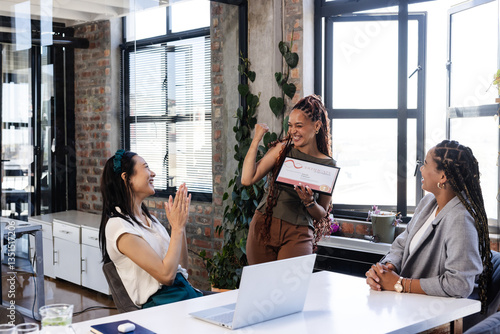 Shower Curtain: Applauding colleague holding award, diverse businesswomen celebrating success in office