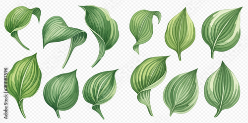 Shower Curtain: Collection of various green Hosta leaves with different shapes, textures, and variegation on a transparent background.