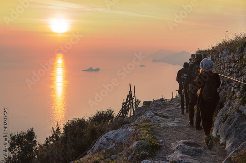 Shower Curtain: Group of young friends walking along the path of the gods illuminated by the light of the sunset over the sea. Amalfi coast, Campania, italy.