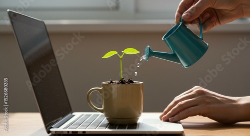 plant, watering, laptop, mug, growth, technology, desk, office, computer, keyboard, leaf, green, table, indoor, work, business, hand, can, small, environment, germ bud, flora, dirtied, care, fresh, new, start, cultivation, gardening, desktop, monitor, screenSHARE