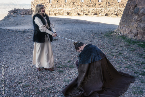 mediaeval, ceremony, accolade, reenactment, woman, man, kneeling, sword, investiture, costume, historical, tradition, culture, event, knight, chivalry, honour, ritual, attire, fur, cape, shawl, heritage, european, history, noble, fortress, feudal, aristocracy, renaissance, pageant, solemn
