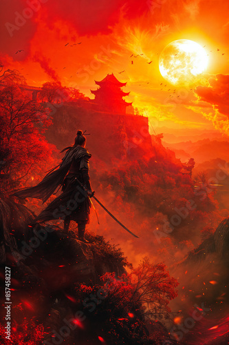 silhouette, samurai, sunset, japan, feudal, ninja, warrior, sky, sun, building, asia, asian, orient, tree, leaf, nature, red, orange