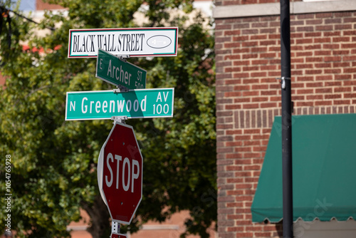 Tote Bags: Tulsa, Oklahoma, USA - June 25, 2023: Afternoon sun shines on a sign of the historic Greenwood District Black Wall Street, site of the 1921 Tulsa Race Massacre.