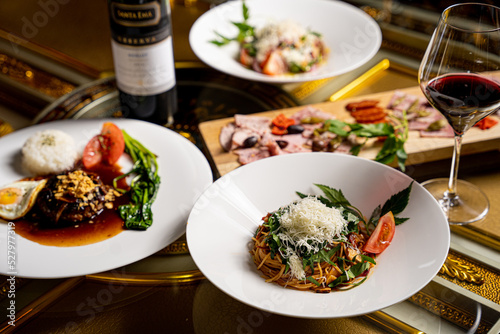 food, dining room, eatery, meal, table, salad, wine, lunch, dish, meat, epicure, healthy, glasses, vegetable, delicious, eating, wine glass, vegetable, salami, ham, euro, menu, dish
