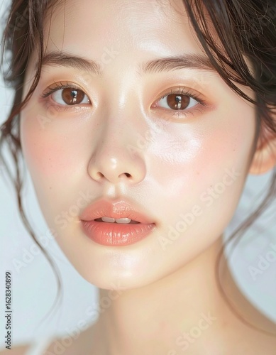 日本人, 清楚な若い女性, 横顔, ナチュラルな笑顔, 柔らかい光, 白背景, 透明感ある肌, 美容広告スタイル Japanese, modest young woman, side profile, natural smile, soft light, white background, translucent skin, beauty ad style