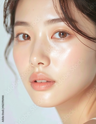日本人, 若い女性, 美白肌, クローズアップ, 欠点のない肌, ナチュラルメイク, 柔らかい光 Japanese, young woman, fair skin, close-up, flawless, natural makeup, soft light