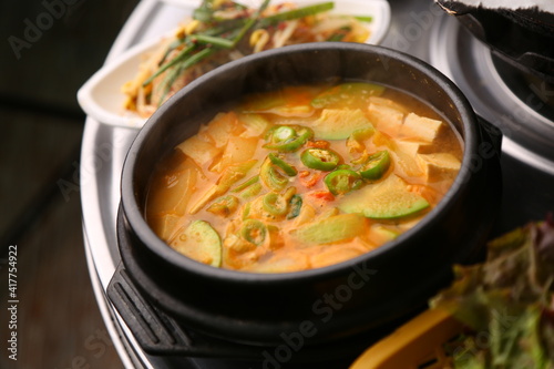 두부가 있는 한국식 뚝배기 된장찌개 Korean-style earthen pot stew with tofu