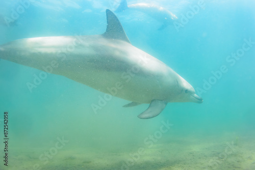ドルフィンスイムで可愛いミナミハンドウイルカの群れが出迎えてくれた。白い子イルカもいる。 日本国石川県七尾市能登島 - 2017年5月5日。 北陸地方の石川県、能登半島の先端にある能登島(北緯37度07分、東経136度59分)は、ミナミハンドウイルカの地球上の北限の生息地として知られている。 Indian Ocean Bottlenose Dolphin (Tursiops aduncus)