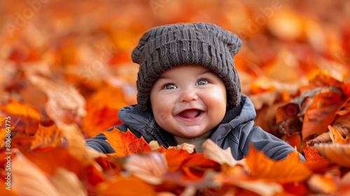 A baby lies in a heap of leaves, mouth agape, wearing a hat