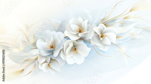A bouquet of white blossoms on a pastel blue backdrop with a golden heart and scattered white petals