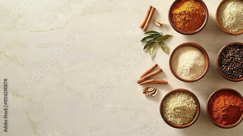 A caption with a picture of bowls filled with various spices arranged on top of piles of cinnamon and cloves
