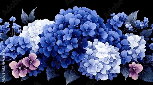 A close-up of a group of vibrant blue and white flowers on a dark backdrop