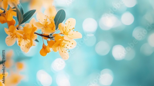 A close-up of a yellow flower on a branch with a soft blue boke in the background