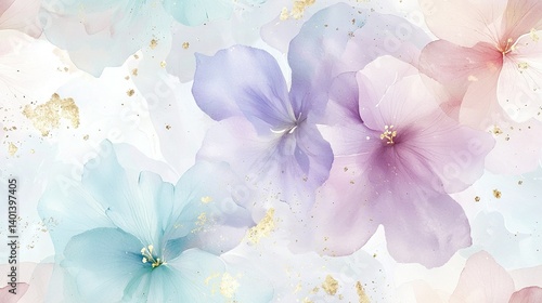 A collection of blue and pink blossoms adorned with gold accents against a backdrop of blue and gold