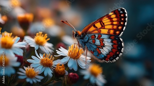 A macro of a butterfly on a bloom surrounded by various foreground blossoms and an out-of-focus background