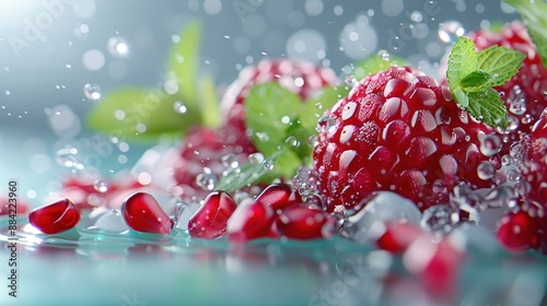 A macro shot of a collection of red berries floating in water with small droplets splashing onto them