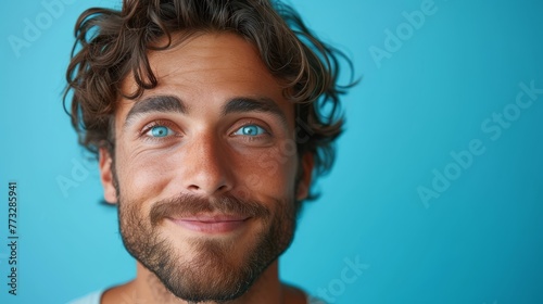 A man with a beard and blue eyes gazes directly into the camera, smiling