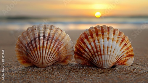 A pair of seashells rest atop a sandy shore, beside the vast ocean, during a serene sunset
