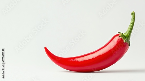 A red pepper with a green stalk protruding from its base, against a white backdrop