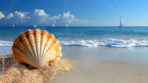 A seashell resting atop sandy shores, adjacent to the vast blue ocean and its sailboats in the distance