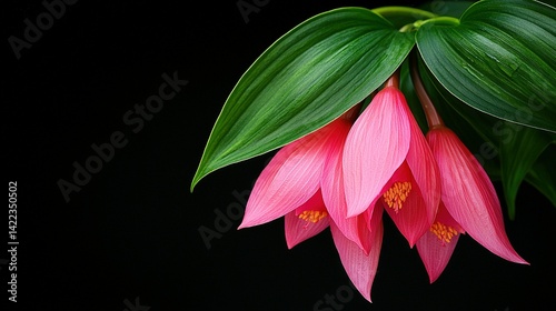 A sharp focus of a vibrant pink blossom, juxtaposed against a dark backdrop, featuring an accentive emerald foliage atop