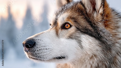 A snowy dog's close-up with tree background