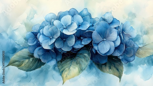 A watercolor painting of a blue hydrangea flower surrounded by green leaves on a blue and white background