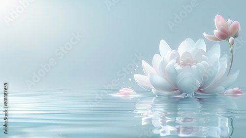 A white bloom drifting atop a body of water, surrounded by a blue sky and a lighter hue above