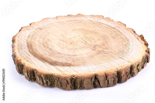 Detailed piece of circular flat cut wood showing annual rings, cracks, bark and texture Slice an oak tree like a wooden plate grove tree trunk showing isolated on white background.