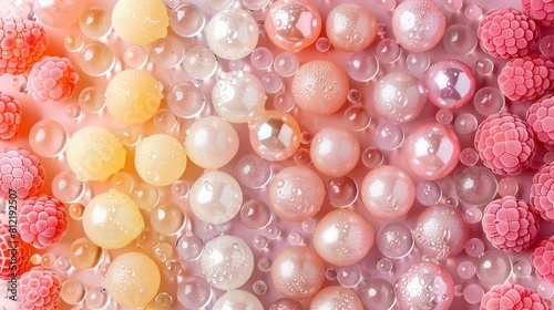 Raspberries and water bubbles adorn a pink and white background with a rainbow hue