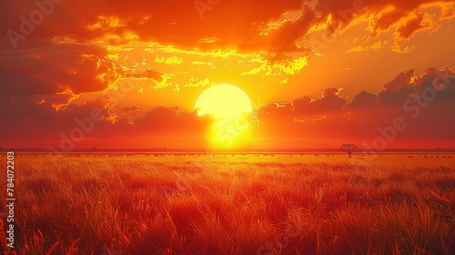 The sun sets over the horizon, casting long shadows on a field of tall grass A solitary tree stands in the foreground